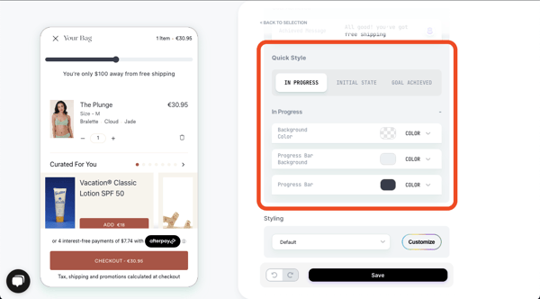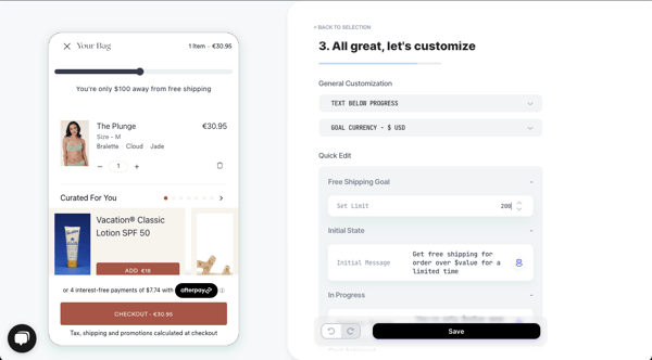 - Set the free shipping goal, and the relevant currency. You can also customize the content and design to suit your brand. You can edit everything from the text and design in each case. Make sure to go over all 3 states for this widget (Initial state > In progress > Goal achieved).