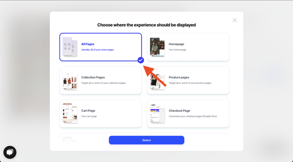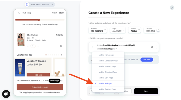 - Select the dropdown on the change block, and then select "Mobile All Pages". This will ensure that the experience is visible across the entire store on mobile.