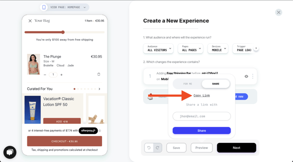 - Make sure to preview the experience to make sure it’s running properly. If you're running the experience on mobile, you can preview it on a mobile device using a generated link by clicking on Preview > Share > Copy Link, and opening the link on your phone.