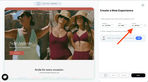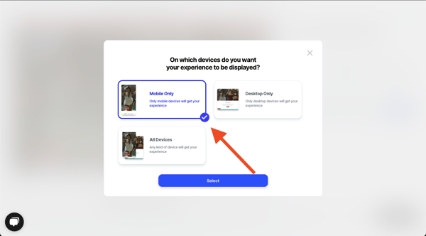 - Under 'Devices' > select either 'Desktop', 'Mobile', or 'All Devices'. For this example, we'll create the experience for mobile only.