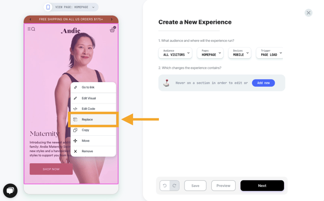 4. In the preview window, hover above the hero image > select 'Replace' > 'Content Blocks' > 'Carousel'.