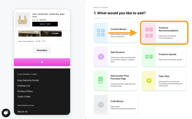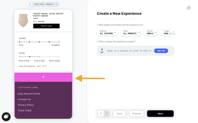 4. In the preview window, scroll down to the bottom of the product page and hover above the footer > click on the '+' icon above it > select 'Product Recommendations' > select 'Mini Collection'.