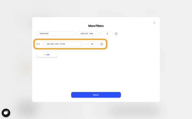 9. Click on 'more filters' > click on '+AND' > select "INCLUDE CART ITEMS" > select 'NO'. This will exclude items that the user already has in their cart.