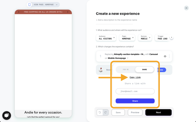 11. Make sure to preview the experience to ensure it’s running properly. If you're building the experience for mobile, please preview it on a mobile device using a generated link by clicking on Preview > Share > Copy Link, and opening the link on your phone.